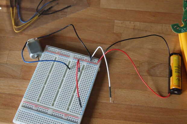 Hacer un circuito muy simple. Usaba un motor pequeño pero un LED sólo funcionaría como buena. Cualquier dispositivo electrónico funcionaría tanto como es fácil de ver cuando se completa el circuito. Esto es solo para probar el interruptor para ver cuánto tiempo se completa el circuito. El mío es unos 3 minutos pero diferentes switches y movimientos del reloj pueden tener diferentes momentos. En el cuadro a continuación puede ver los 2 cables que conectar al interruptor en el cd.