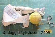 Cortar tres tiras de 2 pulgadas de la toalla de plato en el lado largo. Paquete de las tiras y coloca un nudo en un extremo del paquete. Empujar la pinza a través de ambos extremos de la pelota de tenis, tome el extremo de una de las tiras y tire de la tira a través de los agujeros. Repita esto para las otras dos tiras