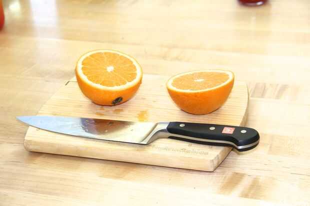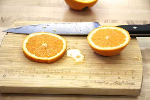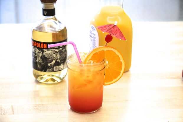 Cortar la naranja por la mitad longitudinalmente, luego corta un trozo de una de las mitades que es aproximadamente 1/4-1/3 pulgadas de espesor. Corte una abertura en este disco de naranja que va desde el centro hacia fuera a un lado y a través de la corteza, así usted puede deslizar sobre el borde de su vaso de manera que se ve como un levantamiento de sol brillante sobre un mar delicioso, delicioso alcohólica de jugo de naranja. Lanza una cereza al marrasquino en el paraguas de cóctel y el paraguas de cóctel con la cereza se pega en él a través de la corteza de la naranja.