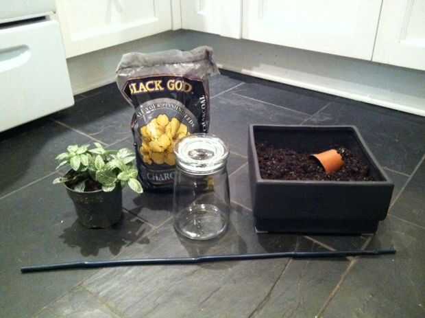 Aquí están los suministros que usted necesitará: su elección de botella o tarro, carbón vegetal, macetas, una pequeña cuchara flexible a cucharada el carbón de leña o suelo en la botella (cuando usted compra su pequeña planta tropical, el envase que viene en es perfecto para esto), su planta pequeño 2-4 pulgadas, un palo flaco o algo con un extremo plano (un palo de bambú se muestra en esta imagen; sin embargo se pueden utilizar las manos o lo que funcione dependiendo en la apertura de la botella o frasco para embalar ligeramente por el suelo) y por último una botella de spray (Ooops! Se olvidó de añadir a este cuadro).