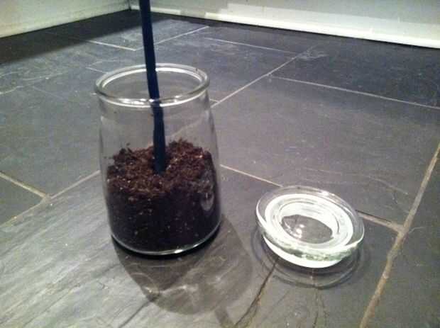 Usando el palo de bambú o el dedo, cavar un agujero lo suficientemente amplio como para adaptarse a las raíces de su planta en. Si su planta termina mirando demasiado grande para su botella o tarro, puede