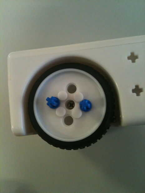 Tomar la ronda, presión lateral e instalar en la rueda de Thymio como se muestra arriba. Repita los pasos 1 y 2 para la otra rueda en el Thymio.