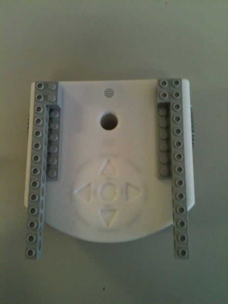 Empezar por encontrar dos piezas de Lego gris plana 2 x 8, dos 1 x 14 gris piezas con agujeros pasando por el centro y piezas de 1 x 2 gris. Ponerlos juntos como se muestra arriba e instale en el Thymio.