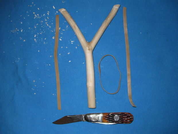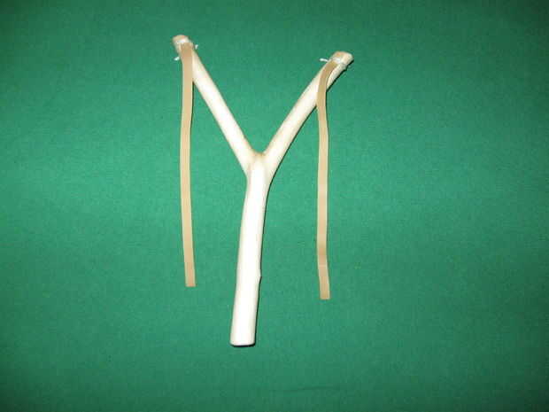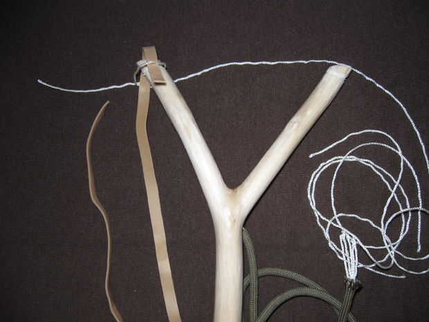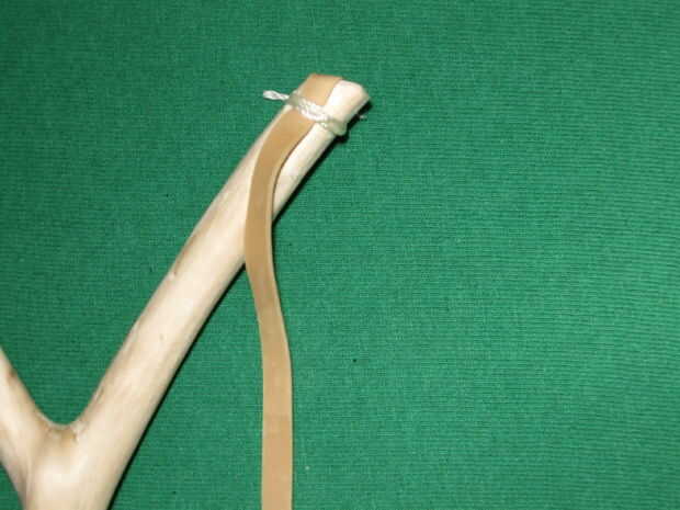 Corte las bandas de goma y coloque sobre los extremos de las horquillas en el mango. Tomar las cuerdas y envolver firmemente alrededor de las bandas, asegurándose de que la cadena se mantiene dentro de las ranuras.