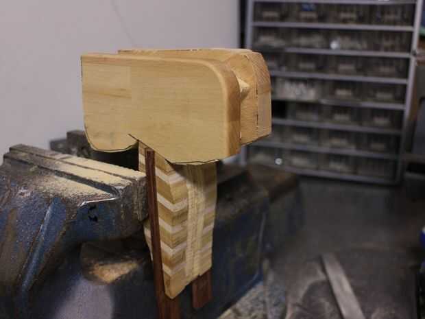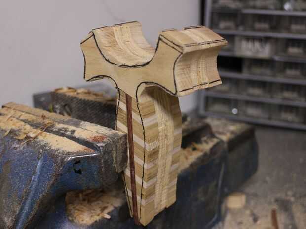 Pegar las escamas y las piezas de la haya sobre la base de madera contrachapada. Usamos el epoxi de dos partes. No exprima el pegamento por demasiada fuerza de sujeción.