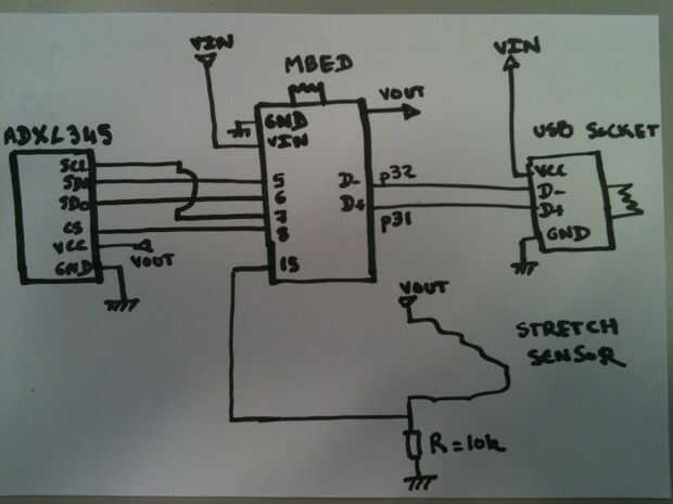 -El sensor stretch que es un resistor es parte de un circuito divisor de tensión. Vamos a leer la tensión en p15 (un pin analógico de la mbed para)