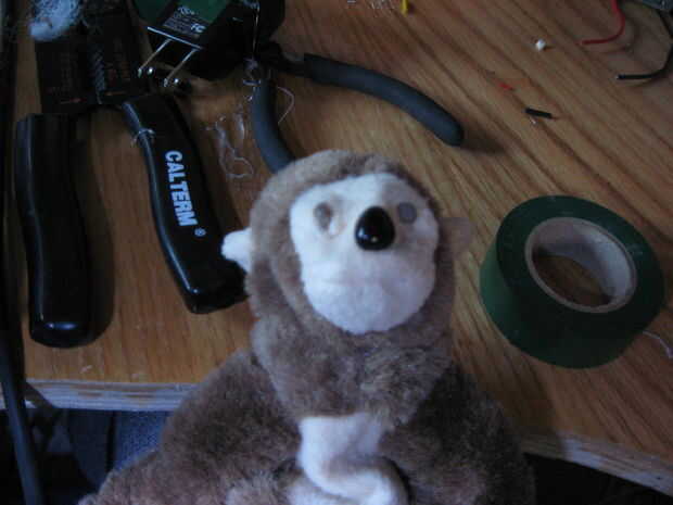 Por el bien de espacio, vamos a poner el altavoz del auricular en la boca, pues situado el altavoz en el centro de la boca y fijarlo con un poco de pegamento caliente. Después, recorta los ojos desde la parte posterior (mediante la reducción de las lengüetas de plástico pequeño dentro de la cara) y sustituirlos con los LEDs configurado anteriormente. Fijar con un poco de pegamento caliente, así. Pase todos los cables para los componentes a través del cuello y después el pegamento caliente, gire la cara vuelta hacia el lado derecho hacia fuera y volver a rellenar la cabeza.