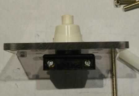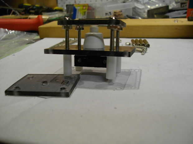 Poner un tornillo de M3 a través de cada orificio de la placa superior y poner una tuerca en la parte inferior, lo mas ajustado posible. Ahora poner un resorte en cada uno. Poner el interruptor en el agujero central de la placa media y enrosque sobre los pernos de la placa superior, encima de los resortes por supuesto. Ahora atornillar a separadores roscados en la parte inferior de la placa media; ajustar la tensión de estos para que el interruptor puede ser presionado correctamente, pero apenas, también Asegúrese de que la placa esté nivel. Ahora el cable a través de la placa inferior del hilo de rosca y tornillo de la placa sobre los espaciadores. Asegúrese de que hay un nudo en la parte superior de la placa inferior.