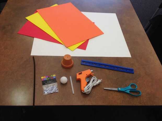 -Un limpiador de pipa -3 diferentes caen hojas de espuma de color -1 tamaño espuma pelota de ping-pong -1 olla de barro -Pistola y pegamento barras de pegamento -Un par de goma de borrar tamaño de ojos saltones -Tijeras -Un lápiz -Papel -Una regla