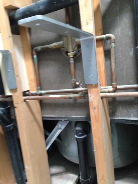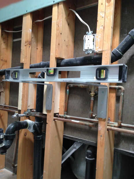 Repita el proceso de fijación de los soportes de acero de 90 grados a lo largo de cada viga que cruza el palmo de su mostrador eventual. Para cada soporte sujetado, recomiendo que busque en el soporte sí mismo y con respecto a los soportes adyacentes.