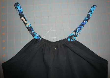 Ajuste trenzado por lo que es igual en ambos lados. Perno en el centro de la carcasa. Se reúnen la camisa igualmente en ambos lados del perno empujando hacia el centro sujetando la trenza. Coser los bordes de la camisa para fijar la trenza. Repetir en la parte posterior, reuniendo a menos.