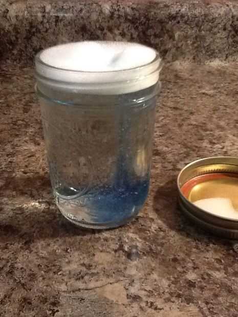 Necesita llenar el vaso casi hasta la licencia superior unos 2cm de espacio en la parte superior de la jarra. Luego puso una cantidad grande de plato dawn jabón en el recipiente. Por último, ponga la tapa en.