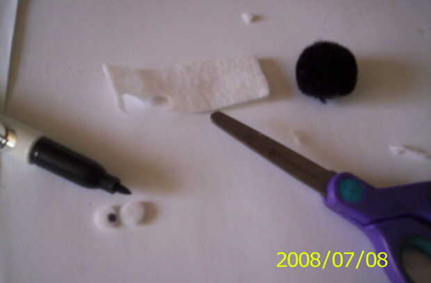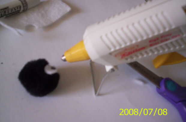 Después de hacer los ojos, tomar una pistola de pegamento caliente y pegamento en la bola de pom pom negro.