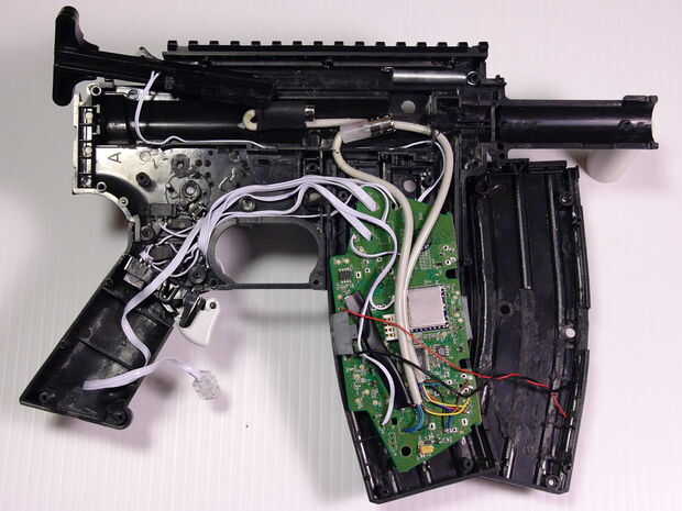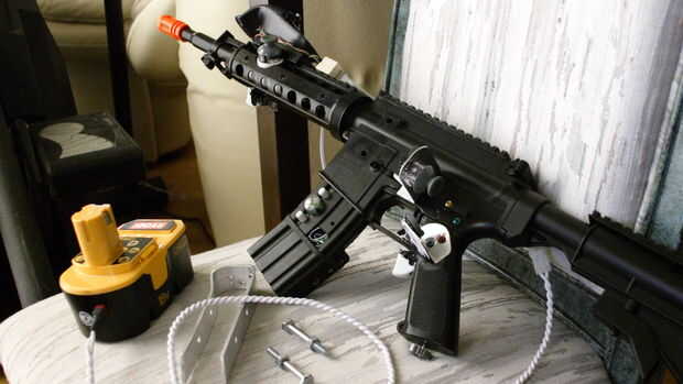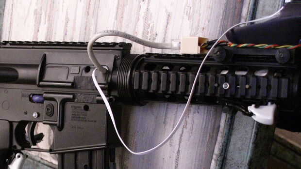 Un rifle fue mi primera opción para esta compilación. El arma utilizado es un Crossman Stinger R34 (réplica de M16). El kit viene con 2 clips y vista reflejo, cuesta alrededor de $40 dólares. Como con las otras estructuras, un ratón de giro fue utilizado para el seguimiento del movimiento. En lugar de utilizar el teclado de giro, un mando inalámbrico Xbox 360 proporciona el resto de las necesidades de entrada.