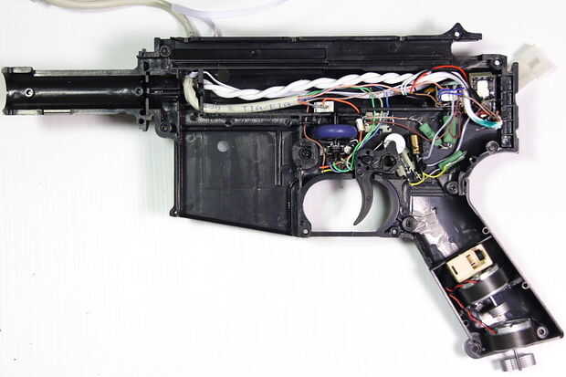 Retroalimentación de fuerza fue también una consideración. Por suerte ambos motores de rumble XBOX 360 encajan el mango. Un solenoide de una válvula de aspersión da un informe satisfactorio cuando se tira del gatillo.