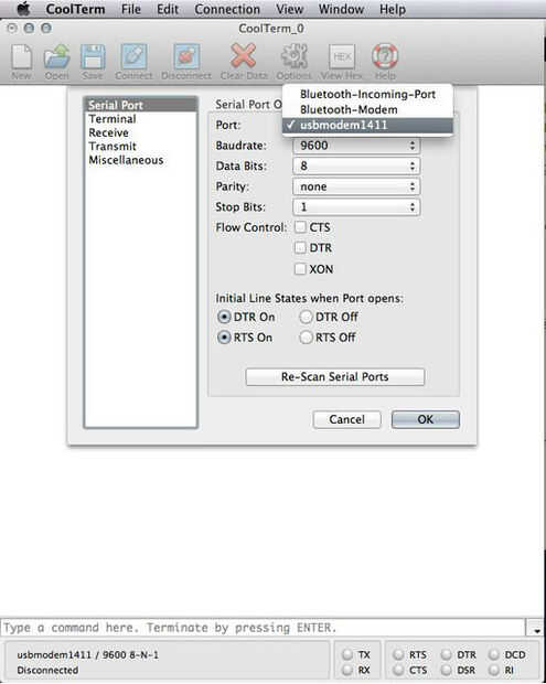 Una vez cargado el código, conecte al puerto serie de Arduino usando Coolterm.