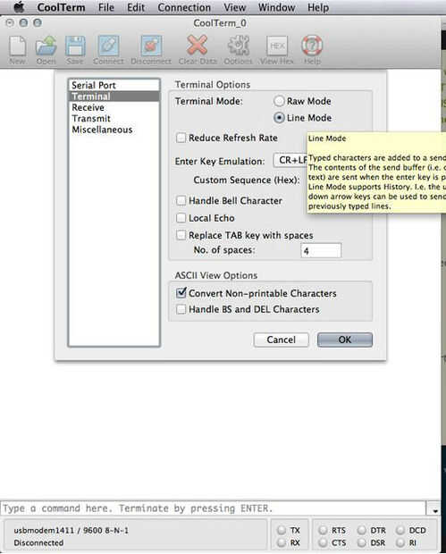 - En Terminal de la izquierda Asegúrese de que está seleccionado el modo de línea de