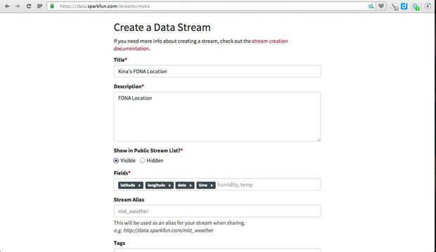 El siguiente paso es crear un lugar para que enviemos los datos de localización que acaba de recibir. Vamos a utilizar un servicio que proporciona de Sparkfun gratis: data.sparkfun.com. Hay un buen conjunto de tutoriales que han reunido para él, para no ser redundante.
