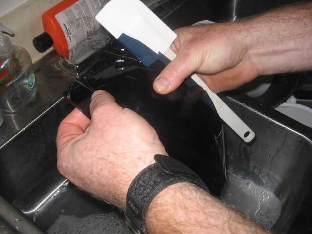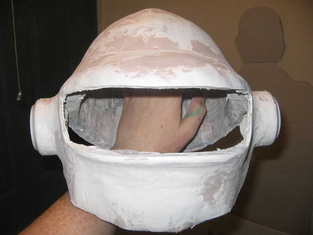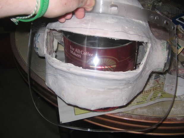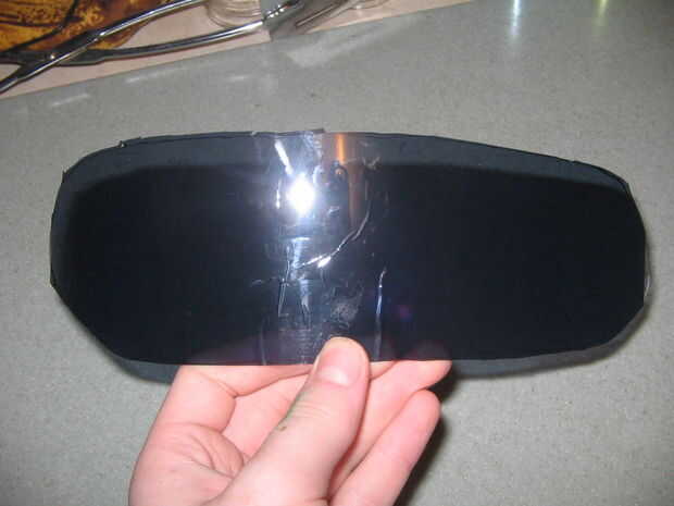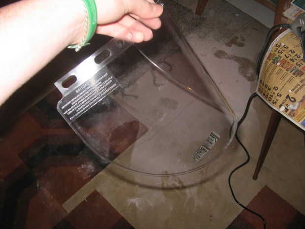 Compró una careta de mi almacén local del hardware y cortar la forma de un visor de ella. Este proceso era ensayo y error. Una vez tuve una buena forma, me puse automóvil tintado, para archivar un aspecto más oscuro. Utiliza pegamento caliente para 'virar' el visor en el casco y utilizado bondo para hacer un sello rasante por el borde exterior de la visera.