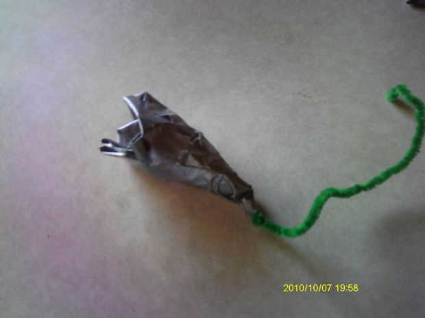 De la rosa primero deberá tomar un pedazo de cinta adhesiva alrededor de 3 pulgadas de largo y doble una esquina hacia abajo y la esquina más cercana a él hacia abajo y luego tomarlo y envuélvalo alrededor del limpiador de pipa y a repetir hasta que tengas una flor tan grande como quieras