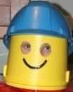 para este paso necesita tomar el cubo amarillo y cortar la parte inferior y retire el asa. Después de esto corte dos agujeros con la dremel para que puedan ver dónde va. Esto puede resultar muy difícil que tal vez necesite ayuda. Después de esto se realiza corte nettion en el casco y pegamento en la mitad de la cubeta en el fondo estaba. Ahora si se hace correctamente usted debe tener lo que se asemeja a un hombre de lego con ninguna sonrisa. Debe agregar el smilwe con un marcador sharpie negro o para obtener mejores resultados debe utilizar pintura de tela artesanales. La cabeza del traje debe parecerse esto cuando haya terminado.