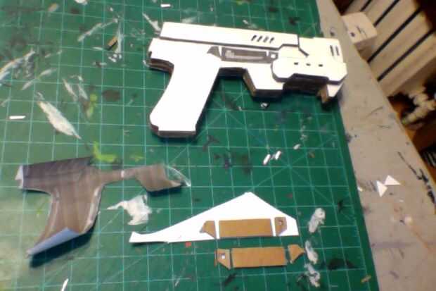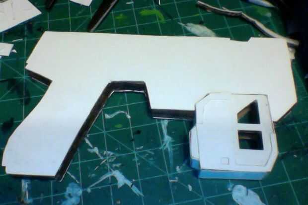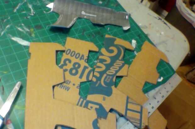 4. ahora sólo picar encima de la plantilla de papel, usando las piezas como las plantillas y corte de cartón. mantener para picar y añadir a su arma. Cuando termines con esa pieza, cubrir esa pieza con cartón cómico.