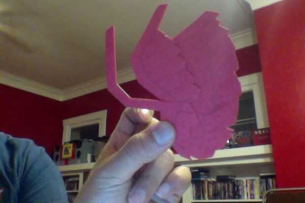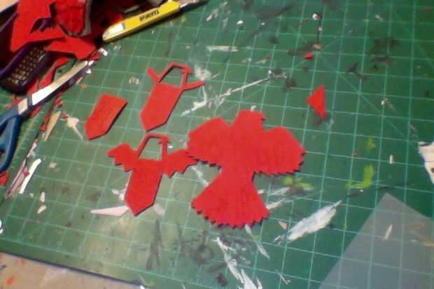-cortar el diseño del arte de la espuma. Al igual que hizo con la divisa, calentar el cuchillo del exacto y pulse a la espuma alrededor de la cola y las alas para crear profundidad. (foto 7)