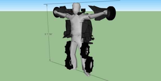 Notas importantes: Tenemos una idea bastante precisa de la altura, de largo, y ancho su cuerpo cuando usted está parado para arriba y cuando estás abajo en su posición transformada. Usted puede ampliar su modelo hacia arriba y hacia abajo para adaptarse a ti en consecuencia. Preste especial atención a la escala de su modelo y asegúrese de verificar sus dimensiones constantemente. No quiero un traje que es demasiado grande o demasiado pequeño. También entiendo que el programa de modelado es simplemente que, es un modelo. Su traje probablemente resultará un poco diferente de lo que piensa, para no empantanarse también en la fabricación de su modelo perfecto.