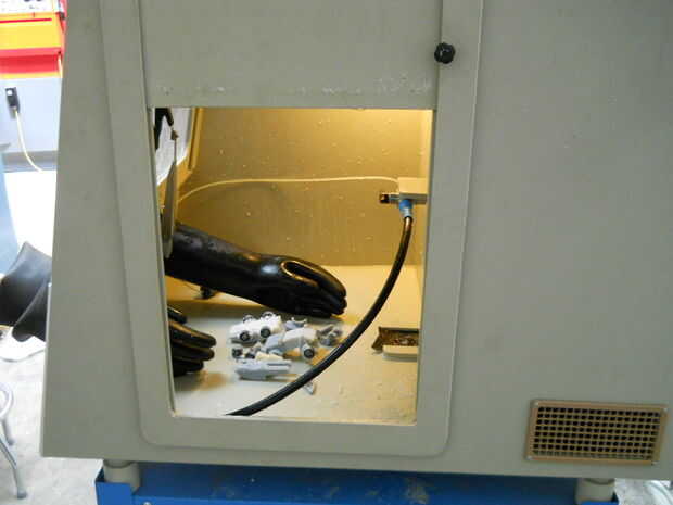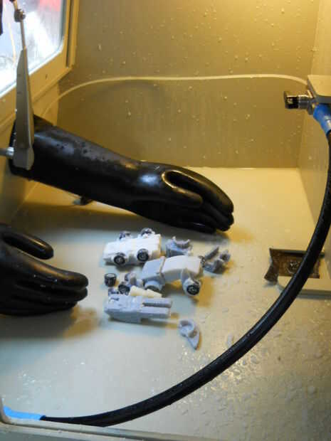En el Instructables Anex en TechShop, utiliza el chorro de agua (para limpieza, no el uno para corte de metal) para quitar el restante material de apoyo.
