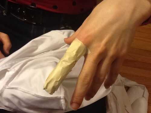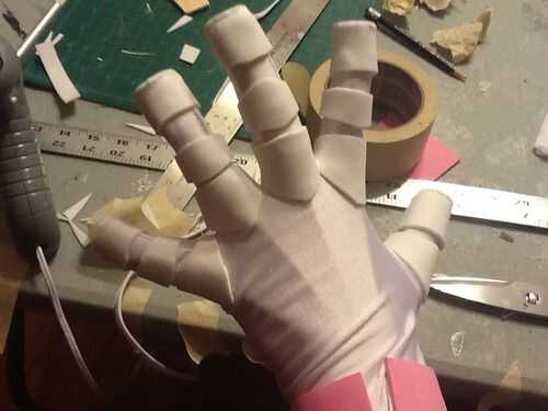 La estera de pegamento será demasiado grande para cosas dentro de tu mano... Envuelva cada dedo en cinta adhesiva y luego poner tu traje. pegamento (Foto 2) la sección para el dedo (Foto 3)... es un proceso laborioso, pero vale la pena el detalle.