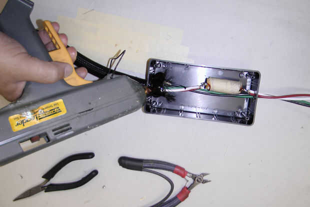 Tome un pedazo de cinco pies de su split acanalado tubería y envuélvalo alrededor del cable en un lado de la caja de la red. Luego, tomar su trenza de nylon y deslice sobre la tubería. Una vez en el extremo de la tubería al lado de la caja de la red, trabajar suavemente ambas capas a través del agujero en la caja. Una vez que los tienes dentro de la caja, utilice una brida de plástico y pegamento caliente para evitar que deslicen hacia fuera otra vez. Me gusta usar el pegamento caliente negro debido al más bajo punto de fusión, que lo hace más líquido lo estándar. Así, se puede trabajar alrededor del cable para asegurarse de que rellene los huecos entre la trenza y el orificio de la caja.