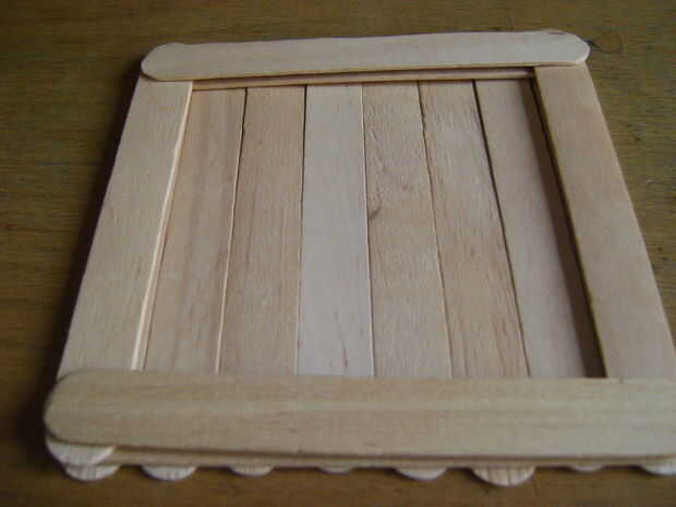Fortalecer la base del otro lado metiendo más palitos. Primera línea de la parte superior y el borde inferior con un palito cada uno. Pegar firmemente y esperar a que sequen. Luego hacer lo mismo para los lados derecho e izquierdos. Repita este capas hasta que tenga dos capas. Esto dará la estructura de una base firme.
