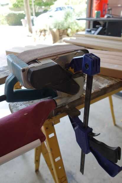 Configurar su lijadora de banda – como punta invertida y amarrarla a mi caballete de aserrar. Yo entonces instalar un cinturón de 80 grano y la lijadora para funcionar continuamente a velocidad 4 (de 5), que me permite una flexibilidad poco en formación; la lijadora realmente puede eliminar mucho material rápidamente a toda velocidad y a veces se pierde más de lo planeado. La arena alrededor de la curva un poco, luego comprobar y ver si has lijado hasta la línea que dibujó, que ambos parecen similares, y que la curva de adelante hacia atrás es más o menos plana. Lijado y comprobar hasta que estés contento con el resultado.