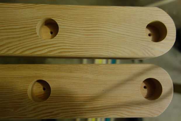 Para mi prototipo surgió lo que yo pensaba que era un método bastante ingenioso para enroscar los tacos en los rieles laterales. Creo que probablemente es realmente exagerada ya que la mayoría de los triángulos que he visto ya que solo se pegan, así que mi método oficial es pegar sólo. ¿Pero si quieres mayor seguridad – tal vez tienes niños muy pesados? – utilizar mi método de tornillo. Tomar una 1/8 broca y taladro recto por el centro de los agujeros que hiciste de cada pasador, utilizando la hierba el forstner poco hecho como su guía. Todos los agujeros del taladro ahora (no intente colocar taquetes en algunos y luego perforar el resto más adelante). Ahora poner un taco en cada agujero y Punta la totalidad del lote sobre la unidad está de pie sobre los tacos en el piso y la baranda del lado enfrenta. Aquí está la parte ingeniosa: el agujero que ha perforado se convierte en un pequeño jig espigado y le permite hacer un agujero piloto hacia abajo en la espiga sin más equipo o apoyo necesario. He perforado 26 de esas cosas y no pop al lado de la espiga una vez. Limpio, ¿EH? Piloto de que todos los agujeros y luego un tornillo a cada piloto en ambas escalas del agujero excepto los dos agujeros superiores en cada riel lateral de la escala larga.