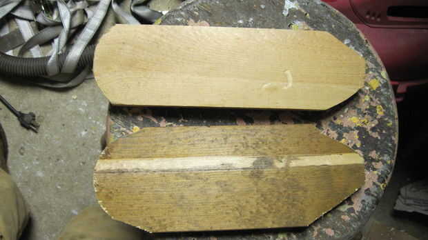 me puse a sacar los enlaces y fije las placas de alguna otra manera, pero entonces tuve una brillante idea de hacer un "boot" que se encaje en los enlaces como una bota de esquí. Mida y corte el talón y dedo del pie a la forma aproximada del interior de los enlaces. Corte de 1 x 4 (puede necesitar afeitarse la Junta un pelo más fino para caber debajo de los labios de la Unión. Luego presionar en.
