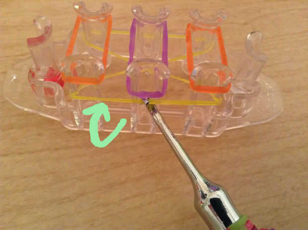 Paso 1: materiales 1 telar, me enganche, bandas y un clipPaso 2: Colocación de bandas Colocar bandas con la flecha mirando hacia fuera. Asegúrese de que las bandas van el telar y bandas solo!!!!!!Paso 3: Colocar triángulos Vuelta a telar y coloque lo