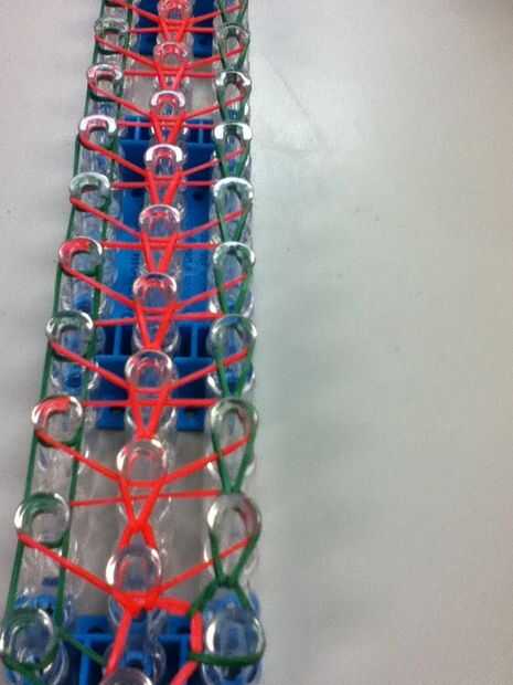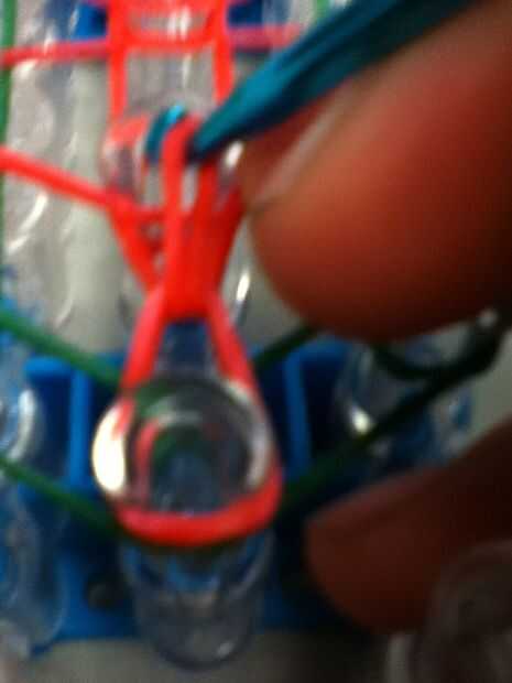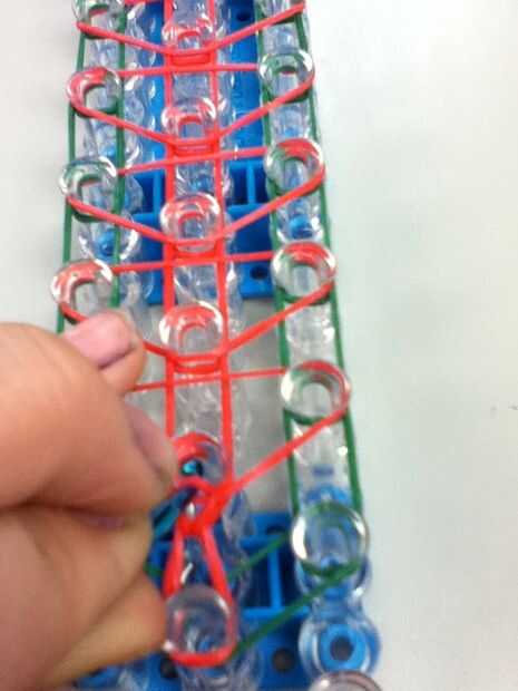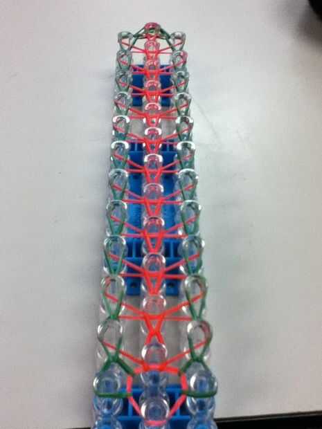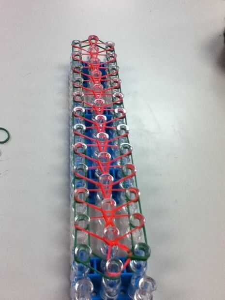 Ol gire su telar el Cs están frente a usted. hoyo de una banda de goma en el extremo que este es como sus bandas de triangleFor el primer principio de la rows.you ponen el ganchillo entre la banda de triángulo y la banda en ese gancho. Tire de la banda hacia arriba dejando una banda en la parte inferior de la anterior y tomarla y conectar al siguiente gancho. Usted tiene que comenzar en el medio ya que es lo que pone en pasado y es en la parte superior vaya a la siguiente en la parte superior al inicio