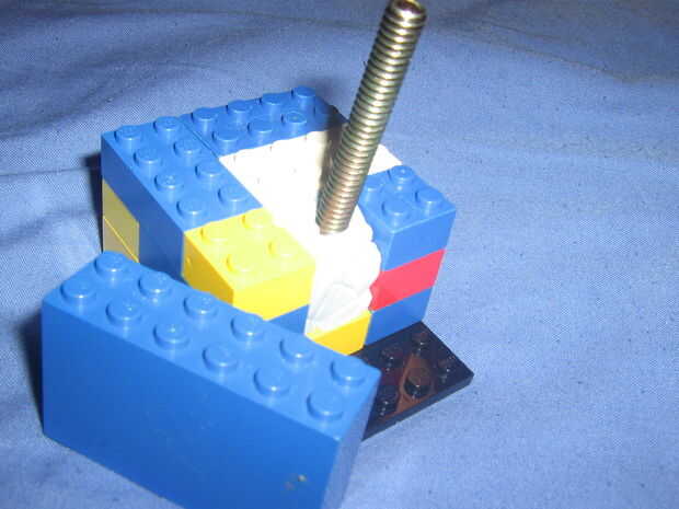 Esto es donde el bloque frente grande viene bien, sacar de su trípode y poner a un lado. Luego coloque el perno de 1/4 de pulgada en la brecha y bluetack hasta es seguro y seguro en su lugar - el uso de la frase con moderación no es uno que se aplica a esto (ver imagen 2). Una vez hecho esto, vuelva a colocar el panel y construir otra capa (ver Fig. 3).