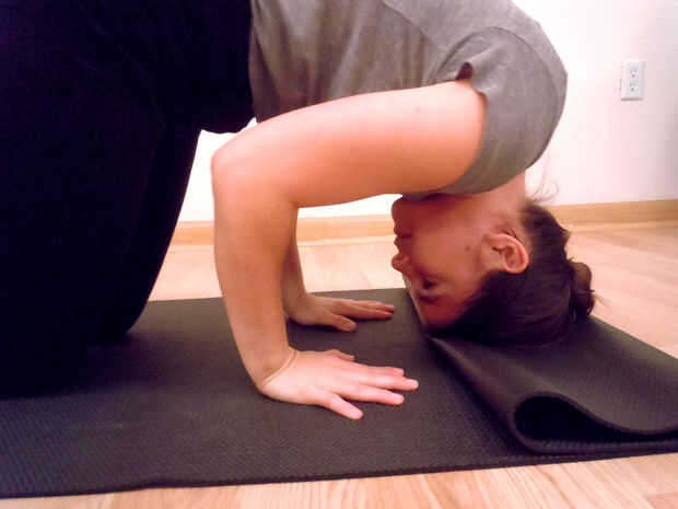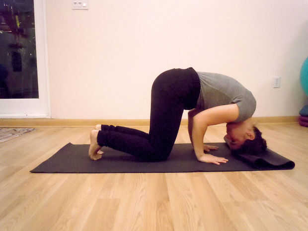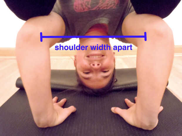 Pongo a cuatro patas y coloque la tapa de la cabeza en la alfombra (no olvides el paso 2). Coloca las manos sobre el piso, los dedos apuntando hacia la cara, anchura del hombro aparte, unas pocas pulgadas delante de su cara. Asegúrese de que los codos en ángulo recto y en apretada, no se inclinó hacia fuera.