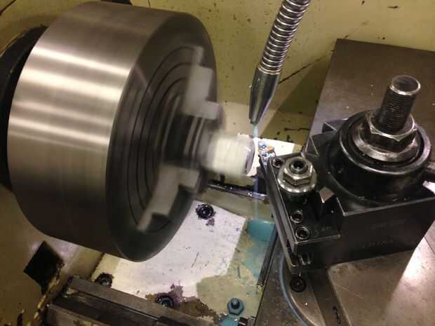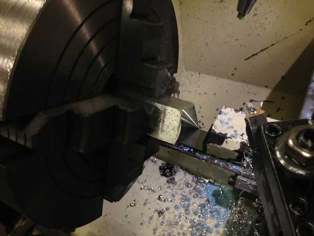 Establece su descanso compuesto en el ángulo que desee en la parte inferior de su trompo. Escogí a 45 grados, pero en retrospectiva, que parece un poco empinadas (poner el centro de gravedad demasiado alto); hacerlo otra vez probablemente elegiría a 60 grados. Utilizar un cortador de la izquierda y configurar en la parte trasera del torno; Esto le permitirá obtener el ángulo deseado sin correr en el portabrocas. Para volver hay probablemente tendrás hacer cross-slide en casi todo el camino. A partir de la utilización de la esquina trasera izquierda de la diapositiva superior para empezar a dar forma a la pieza, regresando hacia el centro y mover el carro un poco pequeñito entre cada corte.  Para obtener un acabado agradable Asegúrese finalizar con un paso agradable, lento, acabado a alta velocidad (~ 9000 para mí).