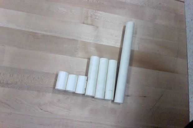 Corte tres piezas de tubo de PVC que es 3,5 pulgadas de largo y reservar. Luego cortar un pedazo de tubería PVC de 8 pulgadas de largo. Por último, corte tres piezas de tubería PVC de una pulgada de largo.