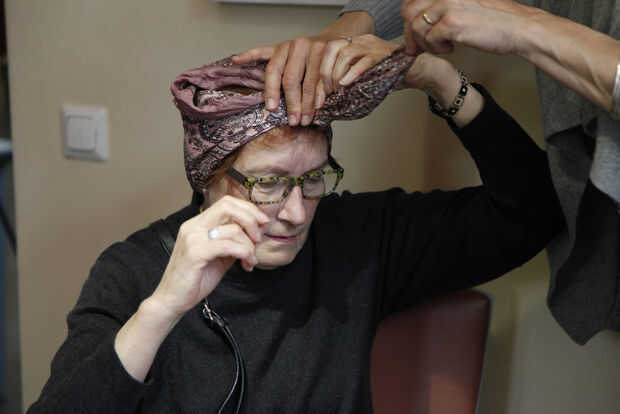 Poner la parte del elástico contra su cuello y tire hacia el frente, los 3 extremos del triángulo, probando el punto adecuado para cerrar la pieza frontal. Marcar con un alfiler y coser el lugar correcto con la ayuda de la máquina o unas puntadas a mano.