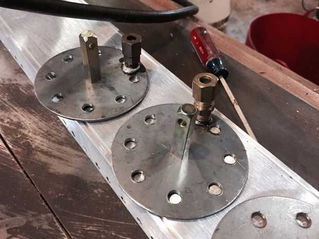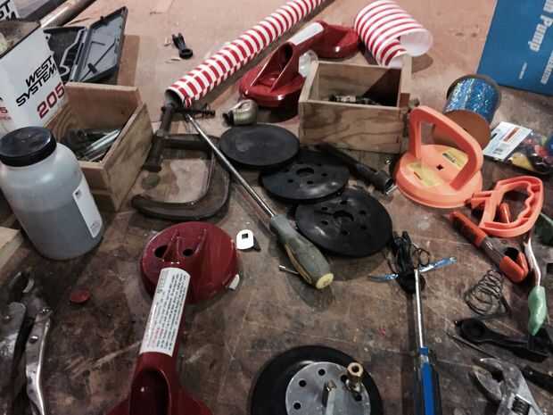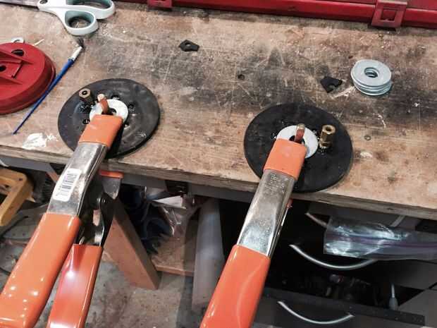 Empecé tomando las tazas de la succión doble HF a pedazos. Luego marqué cuidadosamente la goma encima de las copas con una navaja y con un corte adicional poco pudo quitar los discos de metal interiores. I perforado y golpeado ligeramente los discos para tubo de 1/8 y había atornillado un NTP 1/8 x 1/4" compresión en el disco, en cuanto a estar al ras con la parte inferior del disco (cualquier exceso puede presentarse apagado más adelante) añadí una pequeña soldadura en cada junta para asegurar que el disco. Luego pegué los discos en las copas de goma con Loctite vinilo, tela y plástico adhesivo, teniendo cuidado de asegurarse de que todo se alineó en el proceso. Terminé la goma solo para estar seguro de que tenía buena adherencia de sujeción. Perfore agujeros de 3/4" en el cuerpo de plástico de los elevadores para dar cabida a las líneas de vacío. Pegué unos 1" clavijas de madera dentro de las asas de las tazas de la succión con resina epoxi para reforzarlos. Entonces reuní las copas mientras descartando las palancas de plástico.