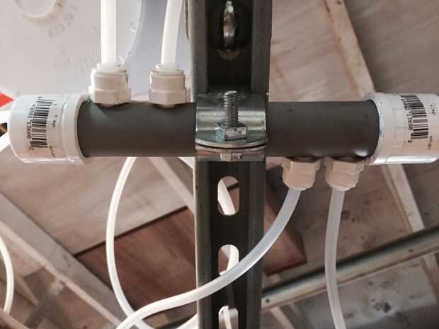 He construido un colector de vacío de 3/4 schedule 40 pvc, taladrado y roscado para tubo de 1/8, luego tapado los extremos. Las tazas de la succión y el colector se unen a una longitud de 2' de Unistrut. Las manijas de la taza de la succión pueden sujetarse con 1.25" conducto Unistrut pinzas., cometí el error de obtener 1,25 abrazaderas que eran demasiado grandes. Usé algunos Unistrut piezas que tenía que poner alrededor de un ojo para el elevador pero un regular 1/2" ojo del perno podrían utilizarse en su lugar.