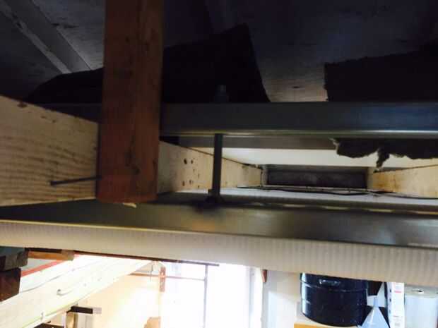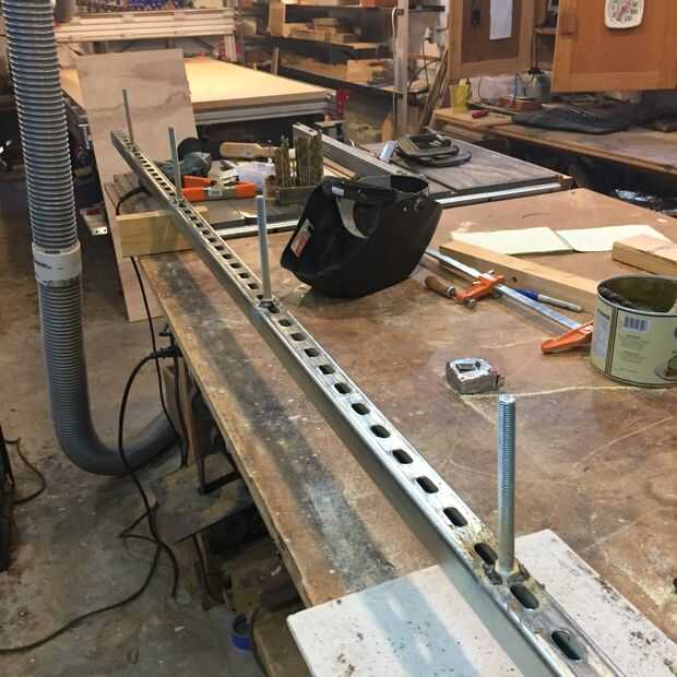 Tengo un techo de celosía en mi taller y no quiero perforar los acordes. por lo que soldado algunos 1/2 x 6 "pernos de la parte superior de la pieza inferior (pista) de puntal y funcionó otra longitud del puntal en la parte superior el acorde menor y básicamente intercala entre los acordes más bajos. Entonces corrí unos tirantes de 2 x 4 del acorde superior hasta el acorde más bajo. Me punto soldando la pista donde se reunieron las 2 piezas. El cuerpo de la carretilla se compone de un par de trozos de chatarra de aluminio canal atornillados a los lados de los carros de ruedas Unistrut 2. Con el tornillo medio pasando por el ojo de la grúa.