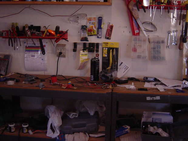 1 tener un espacio de trabajo limpio. Imagen número uno es nuestro banco de trabajo. Un ejemplo perfecto de qué no hacer. Creo que pasamos más tiempo en busca de piezas y herramientas que realmente construir el proyecto.
