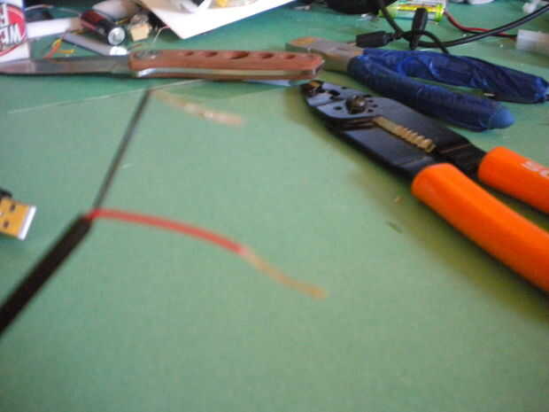 cortar la cabeza del cable usb que no enchufe en la computadora. entonces tira la cáscara exterior de los cables revela los alambres internos. Localice los cables rojo y negro y desechar el resto. tira de los cables rojo y negro.