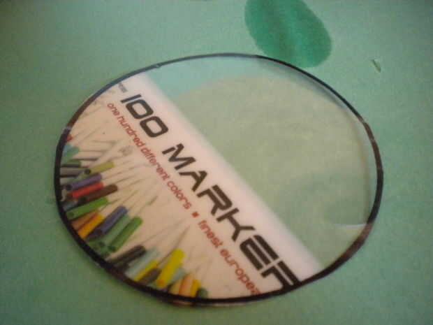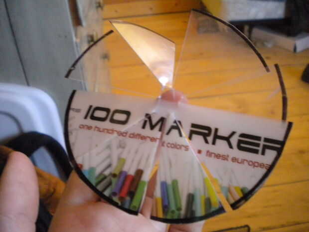 con un pedazo circular de plástico no mayor de tres pulgadas ocho cortes hacia el centro. debe tener ocho piezas triangulares conectados entre sí ligeramente gire cada pieza en una sola dirección para espaciar hacia fuera de los bordes.