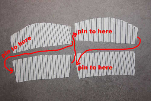 Pin cada pieza de la manga junto en los lados para hacer una pieza de largo continua. (En este orden: cap de manga + abajo + cap de manga inferior pieza. Si eres totalmente anal sobre esta pieza que empareja las piezas dobladilladas de Step 7), una de las piezas de la parte inferior cortar por la mitad a lo ancho - y el pin cada mitad a los bordes exteriores de esta pieza se unieron. Es decir, parte inferior pieza mitad + cap manga + abajo + cap de manga inferior pieza la mitad. Pero soy perezosa y así no molesta - y creo que en el vestido que realmente no puedes decir.)