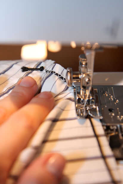Hacer un nudo doble en el extremo de su cuerda elástica. Coloque en el lado equivocado, a lo largo de la parte superior de la pieza de volantes que solo cosido (aproximadamente 3/8" del borde). Usando una puntada floja en su máquina de coser zig-zag sobre la cuerda elástica todo el camino alrededor de la pieza de la colmena. No coser a través del cable - debe seguir siendo libre y movible bajo sus puntadas. Pespunte de un par de veces al principio y al final de la costura para reforzarla.
